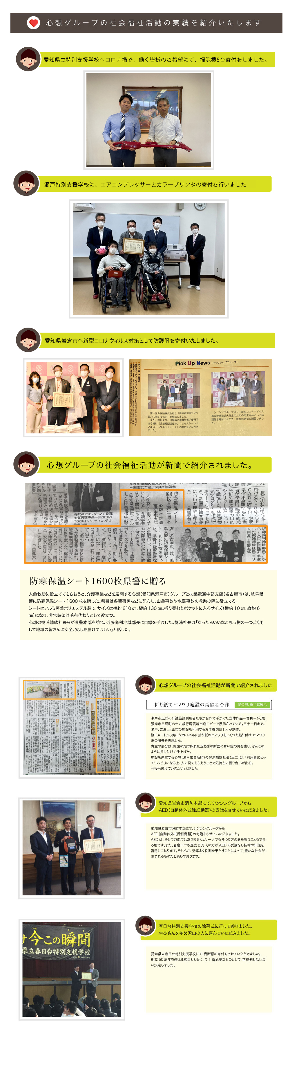 株式会社心想は、愛知県の瀬戸市・尾張旭市を中心に介護事業・飲食事業・フィットネス事業を展開する地域密着型企業です。